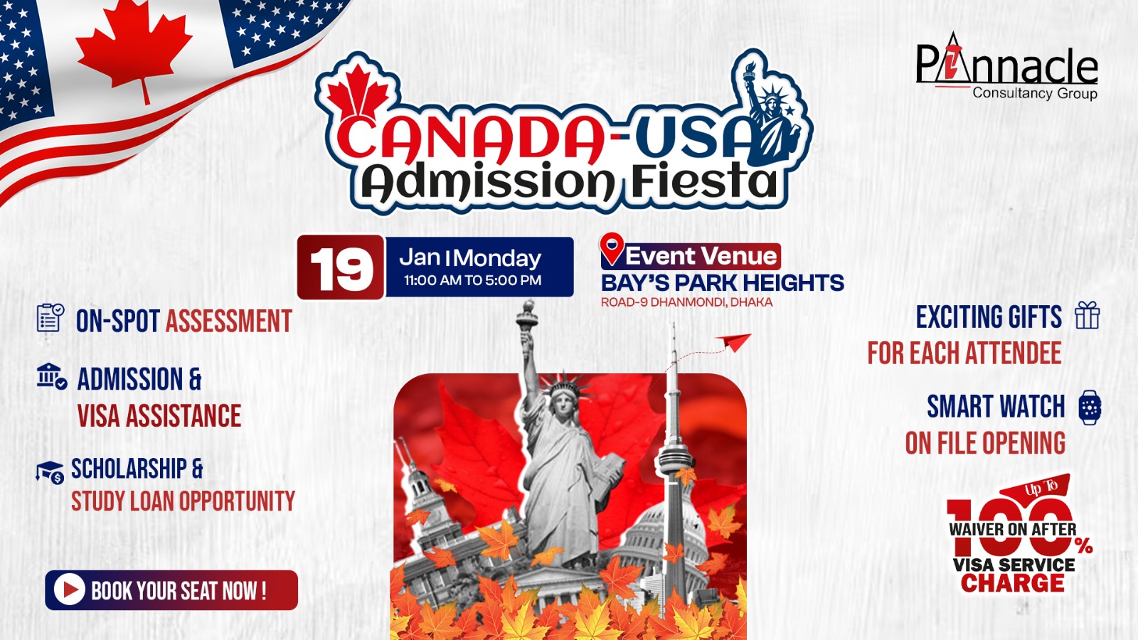 Join Canada–USA Admission Fiesta 2026, a dedicated admission event by Pinnacle Consultancy Group, designed to help students explore North American study opportunities and confidently plan for their 2026 intakes.